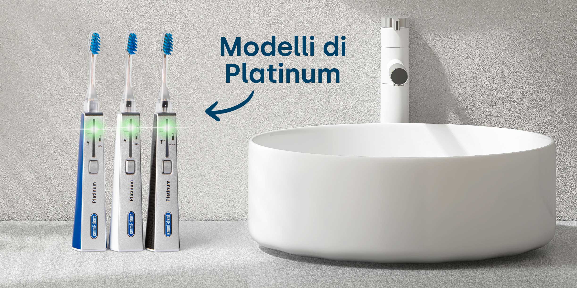 Gli spazzolini ad ultrasuoni sono un'evoluzione dello spazzolino elettrico e probabilmente la cosa migliore che puoi fare per i tuoi denti. Quando si cerca il modello giusto, bisogna prestare attenzione ad alcuni dettagli che possono influire sia sul risultato della pulizia che sul comfort di utilizzo. Con il nostro spazzolino ultrasonico Platinum offriamo un prodotto in grado di soddisfare tutti i requisiti importanti di un buon spazzolino elettrico. Con una frequenza fino a 96 milioni di vibrazioni multifrequenza al minuto, il nostro spazzolino elimina efficacemente placca e batteri, senza dover strofinare. Anche con un uso quotidiano, la batteria del nostro spazzolino ultrasonico dura fino a 15 giorni. Dopodiché puoi semplicemente ricaricare lo spazzolino nella pratica stazione di ricarica. Inoltre, abbiamo installato un motore elettrico nei nostri spazzolini a ultrasuoni (serve solo come feedback, non ha alcun impatto sull'efficacia degli ultrasuoni. Può essere opzionalmente spento completamente) con un esclusivo sistema a 4 pin, che è racchiuso in un alloggiamento impermeabile. Le diverse testine dei nostri spazzolini elettrici con ultrasuoni sono disponibili in diversi modelli e misure, così puoi sceglierle in base alle tue esigenze. Gli spazzolini ad ultrasuoni emmi-dent sono disponibili nei colori nero, bianco o blu.