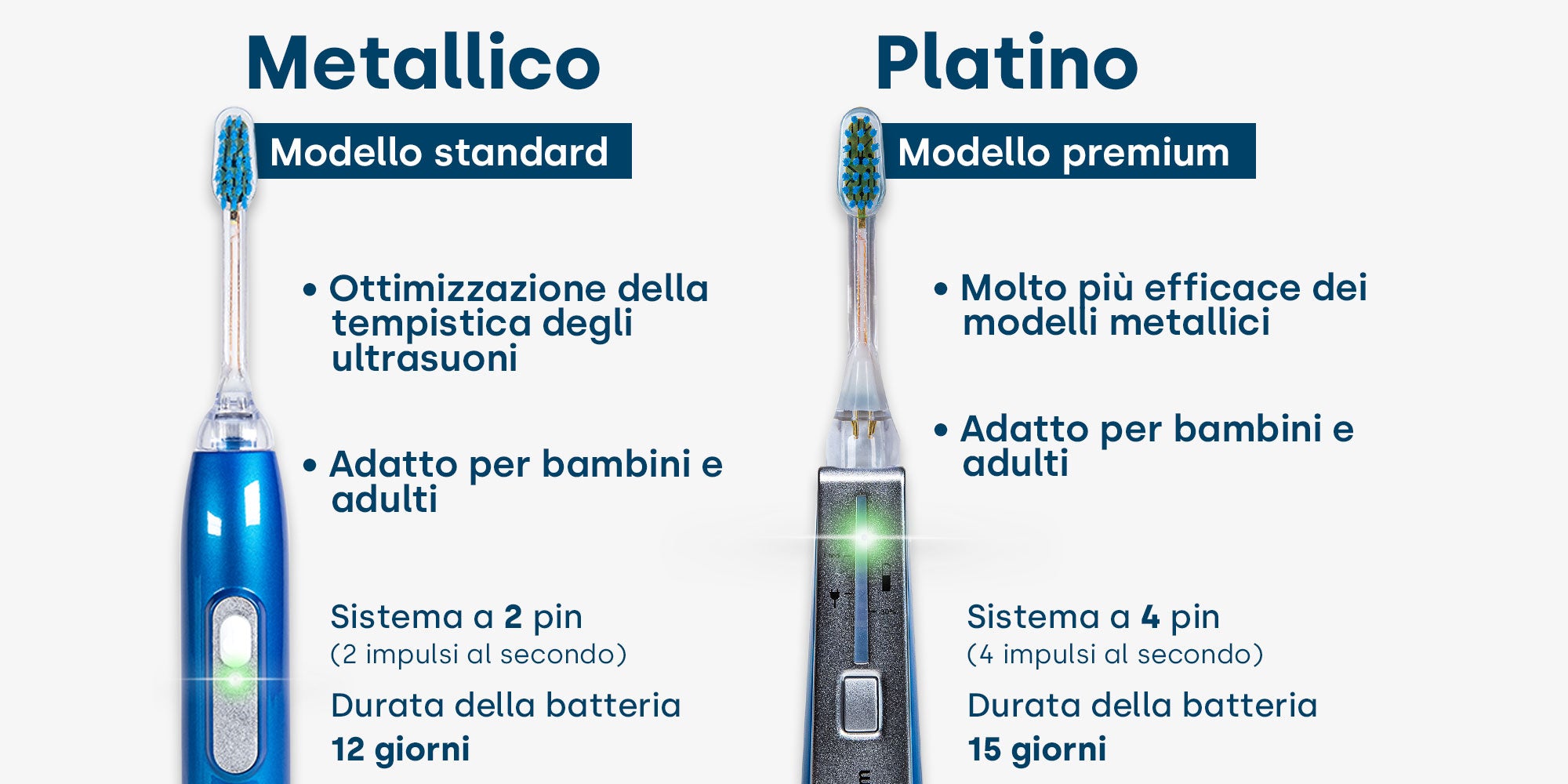 Il modello Platinum supera i modelli Metallic in termini di efficacia. Anche in questo caso, gli utenti di tutte le fasce d'età possono trarre vantaggio dalla tecnologia avanzata. Con un sistema a 4 pin e una durata della batteria di 15 giorni, il modello Platinum rappresenta il massimo della cura dentale ad ultrasuoni.