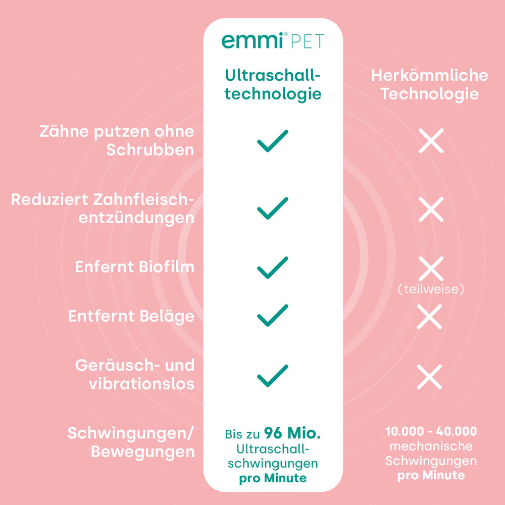 Die emmi-pet 2.0 basiert auf der patentierten Ultraschall-Technologie (bis zu 96 Mio. Ultraschallschwingungen pro Minute) und beugt somit, bei regelmäßiger Anwendung, Zahnstein vor und reduziert Plaque effektiv. Durch die regelmäßige Anwendung wird nicht nur die Bildung von Zahnbelag verhindert, sondern auch das Zahnfleisch massiert, gestärkt und existierende Zahnfleischentzündungen reduziert.