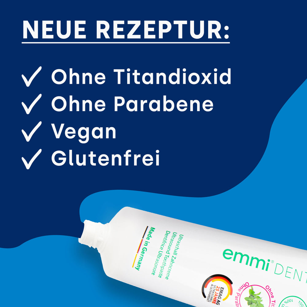 Die beste Zahnpasta ohne Titandioxid ist die, die nicht nur effektiv reinigt und schützt, sondern auch natürliche Inhaltsstoffe verwendet. Eine solche Zahnpasta ist unsere emmi-dent Fresh Zahnpasta. Sie enthält keine schädlichen Stoffe wie Titandioxid, Parabene oder Gluten und ist vegan. Stattdessen setzen wir auf die Kraft von natürlichen Inhaltsstoffen wie Xylit und Kieselsäure, die bekannt für ihre pflegenden und karies prophylaktischen Eigenschaften sind. Zudem sorgt unsere innovative Ultraschalltechnologie für eine gründliche Reinigung auch in den kleinsten Zahnzwischenräumen. So wird Ihre Zahnpflege nicht nur sicherer, sondern auch effektiver.