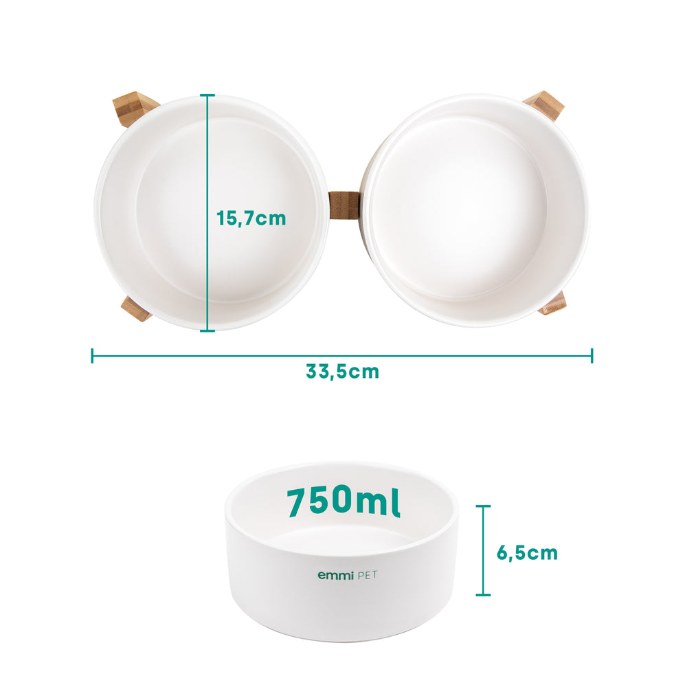 Der emmi-pet Wasser- und Futternapf in einem besteht aus hochwertigem Keramik und bietet eine praktische sowie platzsparende Lösung für die Fütterung deines Hundes. Um den täglichen Gebrauch standzuhalten ist er sehr robust und gewährleistet eine lange Lebensdauer. Die angenehme Schwere der zwei Näpfe sowie das dazu passende Holzgestell bieten Stabilität und sichern den Genuss der täglichen Futterration. Die glatte Oberfläche der Hundenäpfe machen eine tägliche Pflege und Hygiene einfach. Sie können mit der Hand gespült oder in der Spülmaschine gereinigt werden. Dank der rutschfesten Basis stehen die Keramiknäpfe stabil auf dem Boden und verhindern ein Umstoßen. Das minimiert Verschüttungen und gewährleistet eine saubere Umgebung. Das Holzgestell ist mit einem Lack überzogen, um vor Wasser zu schützen. Die Futterbar für kleine und große Hunde ist dank der modernen Optik ein Blickfang für jeden Tierbesitzer.