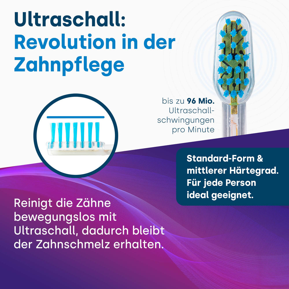 - Innovative Ultraschallübertragung: Bis zu 96 Millionen Schwingungen pro Minute für eine tiefenwirksame Reinigung – ideal für schwer erreichbare Stellen.