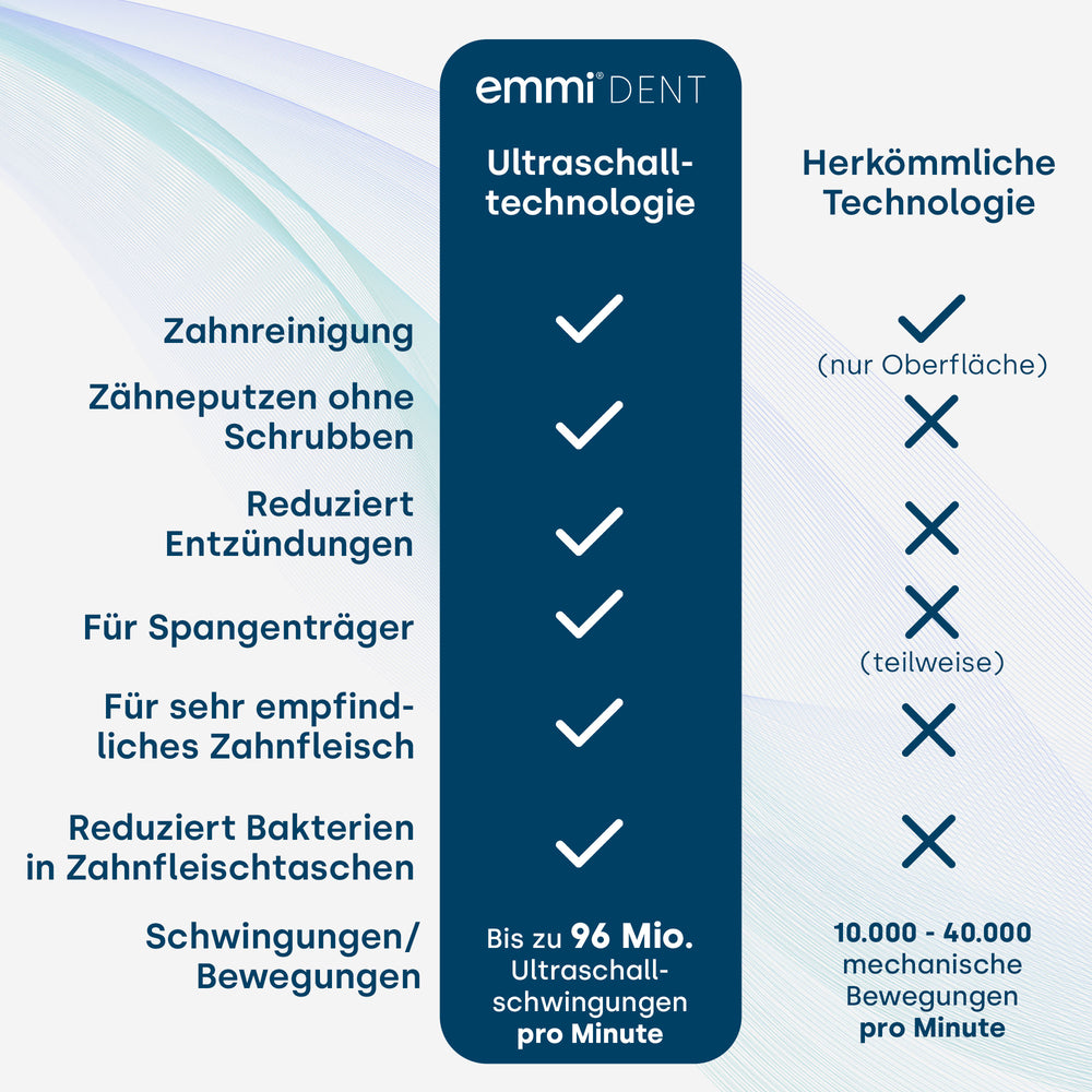 Die Ultraschalltechnologie der emmi-dent Slim revolutioniert die tägliche Mundhygiene. Mit 96 Millionen Schwingungen pro Minute erzeugt sie Ultraschallwellen, die tief in Zahnzwischenräume und Zahnfleischtaschen eindringen. Diese hochfrequenten Schwingungen lösen Plaque und Bakterien effektiv, ohne dabei die empfindliche Zahnsubstanz oder das Zahnfleisch zu belasten.Im Gegensatz zu herkömmlichen elektrischen Zahnbürsten verzichtet die emmi-dent Slim auf mechanische Bewegungen. Stattdessen nutzt sie die Kraft des Ultraschalls, um eine gründliche und zugleich sanfte Reinigung zu gewährleisten. Diese innovative Methode ist besonders vorteilhaft für Menschen mit empfindlichem Zahnfleisch, Parodontitis oder Zahnfleischtaschen.
