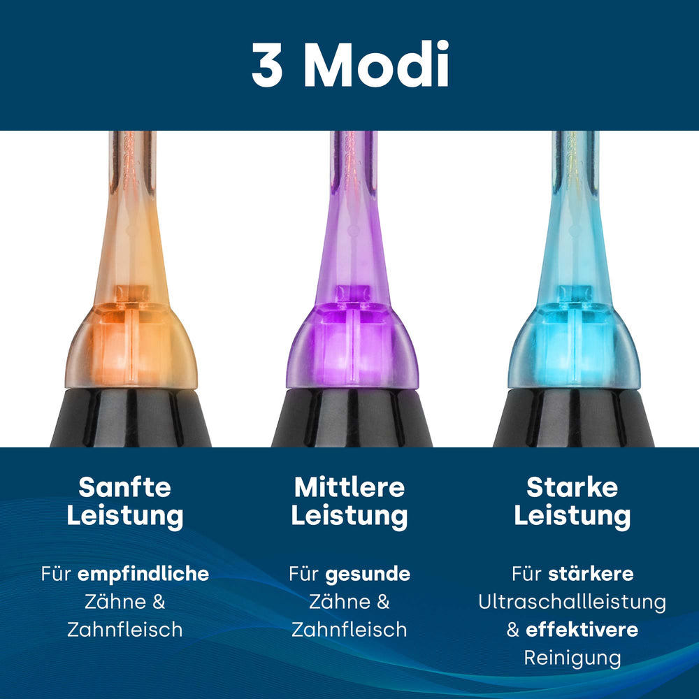 Dank der drei individuell wählbaren Reinigungsmodi lässt sich die Ultraschallzahnbürste optimal an deine Bedürfnisse anpassen. Im sanften Modus reinigt sie besonders schonend und ist ideal für empfindliche Zähne und sensibles Zahnfleisch geeignet. Der mittlere Modus eignet sich perfekt für die tägliche Zahnpflege, während der starke Modus eine intensivere Reinigung mit erhöhter Ultraschallleistung bietet – für ein besonders sauberes Gefühl.