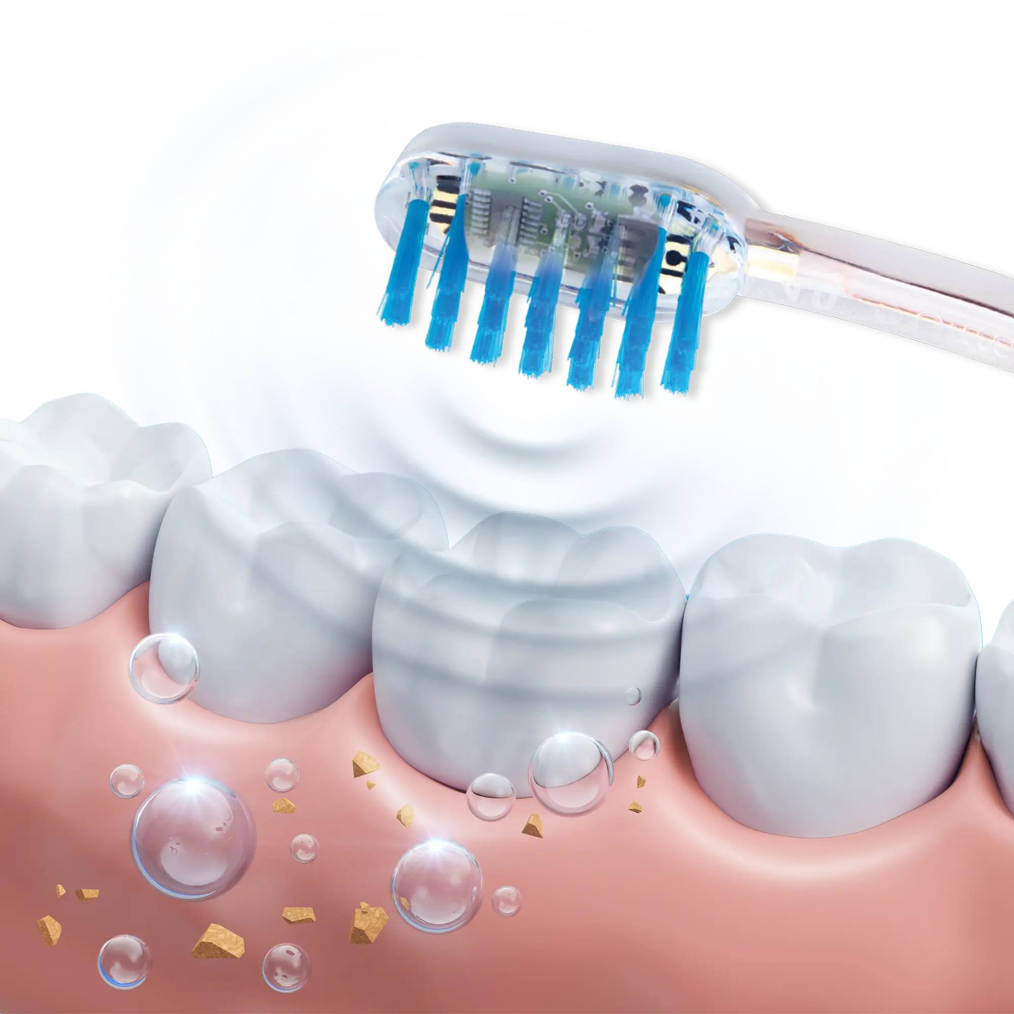 Unsere Ultraschallzahnbürsten sind mit intelligenten Bürstenköpfen ausgestattet, die einen patentierten Piezo-Chip enthalten, um eine herausragende Reinigungsleistung zu bieten und Verunreinigungen sowie Ablagerungen im Mundraum effektiv zu entfernen.