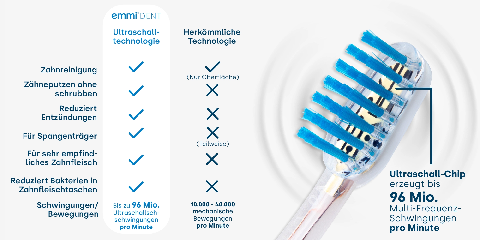 Dank innovativer Ultraschalltechnologie werden Zähne sanft und gründlich gereinigt – ganz ohne Schrubben. Mit bis zu 96 Mio. Multifrequenz-Schwingungen pro Minute entfernt die Reinigung Plaque, Bakterien und Ablagerungen besonders schonend. Da keine Reibung entsteht, bleibt der Zahnschmelz unversehrt und Ihr Zahnfleisch optimal geschützt.