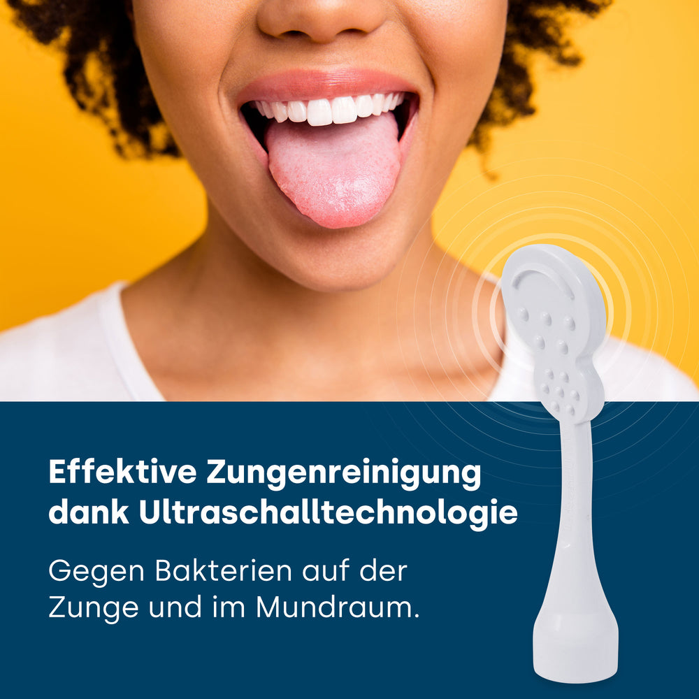 Mit Hilfe des emmi-dent Zungenreinigers können Bakterien durch Ultraschall reduziert werden. Für die Anwendung wird der Zungenreiniger auf die emmi-dent Zahnbürste aufgesteckt.