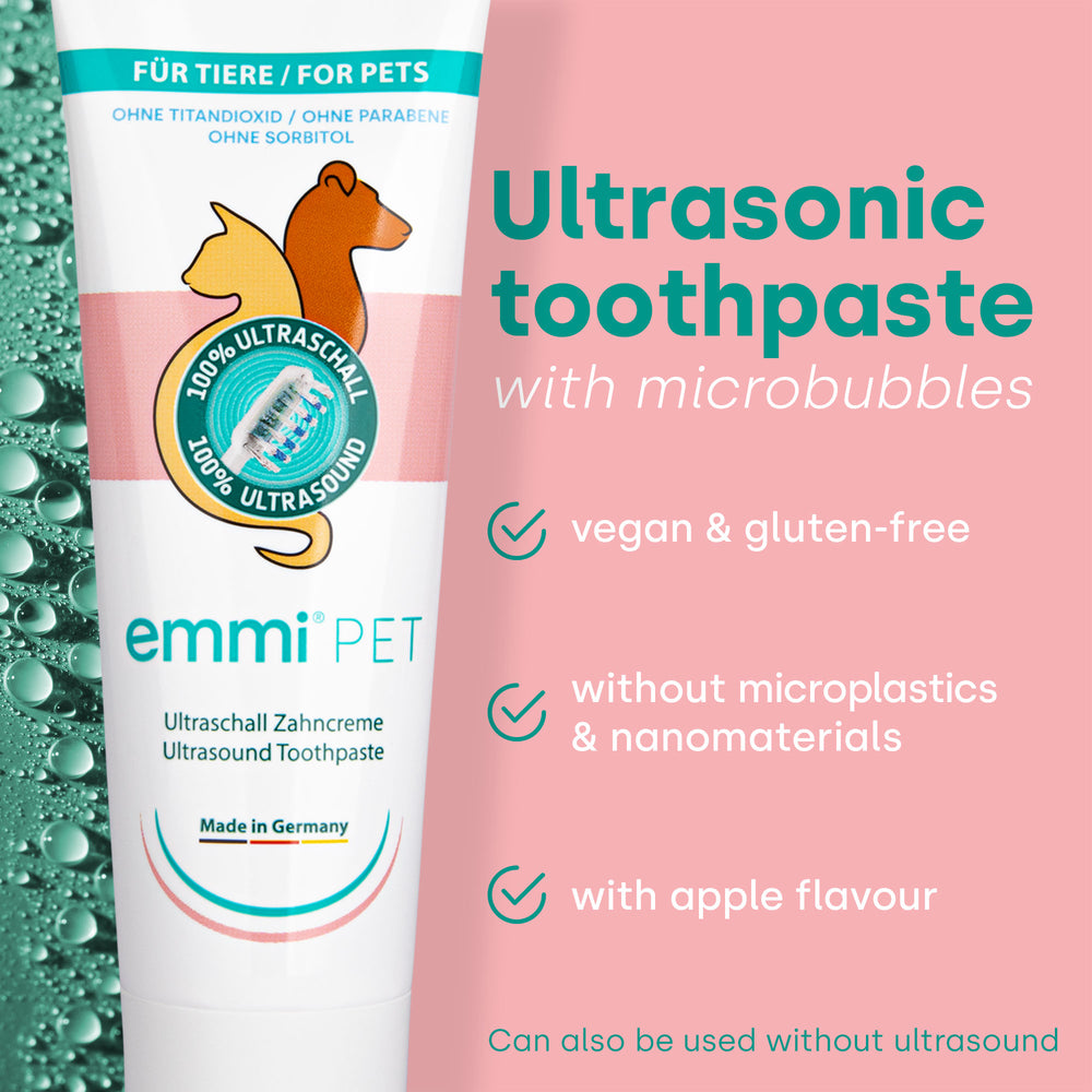 The emmi-pet ultrasonic toothpaste for animals offers numerous advantages that make it an excellent choice for your pet's dental care: Gentle cleaning without abrasion: Thanks to the ultrasound, there is no need for abrasive brushing of the teeth. The RDA value (Relative Dentin Abrasion) is 0, which means that the toothpaste is particularly gentle on your pet's enamel and gums. Effective removal of biofilms and bacteria: The microbubble technology ensures that even stubborn plaque and bacteria are removed without placing mechanical strain on the teeth. Prevention of tooth and gum diseases: Gentle but thorough cleaning preserves the natural protective functions of the teeth, significantly reducing the risk of tooth and gum diseases. Combating bad breath: Regular use of emmi-pet toothpaste helps prevent bad breath by reducing the number of odor-causing bacteria.