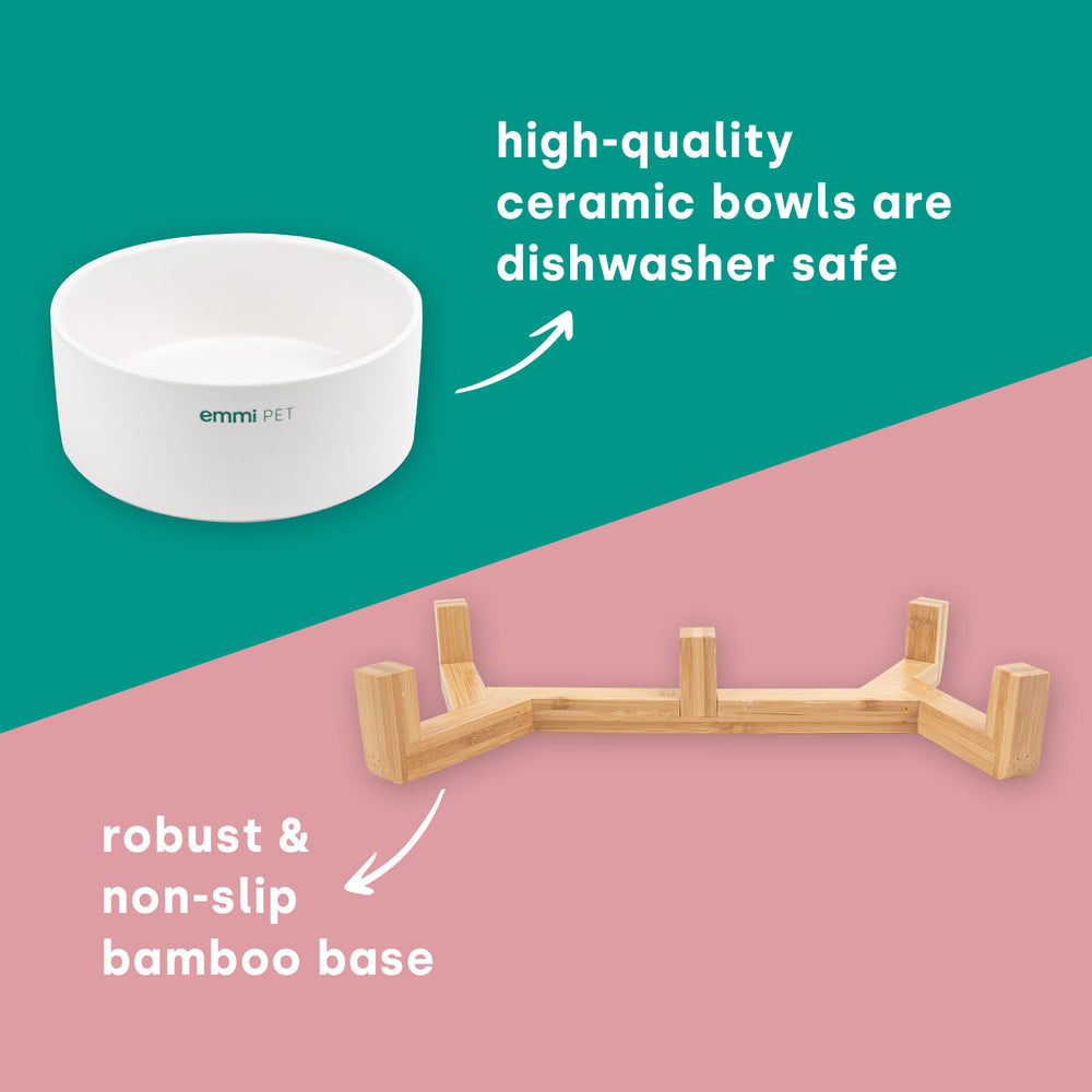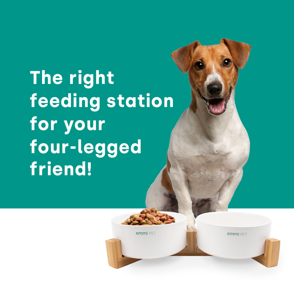 The emmi-pet water and food bowl in one is made of high-quality ceramic and offers a practical and space-saving solution for feeding your dog. It is very robust to withstand daily use and ensures a long service life. The pleasant weight of the two bowls and the matching wooden frame offer stability and ensure that the daily ration of food is enjoyed. The smooth surface of the dog bowls makes daily care and hygiene easy. They can be washed by hand or cleaned in the dishwasher. Thanks to the non-slip base, the ceramic bowls stand firmly on the floor and prevent them from being knocked over. This minimizes spills and ensures a clean environment. The wooden frame is coated with varnish to protect against water. The feeding bar for small and large dogs is an eye-catcher for every pet owner thanks to its modern look.