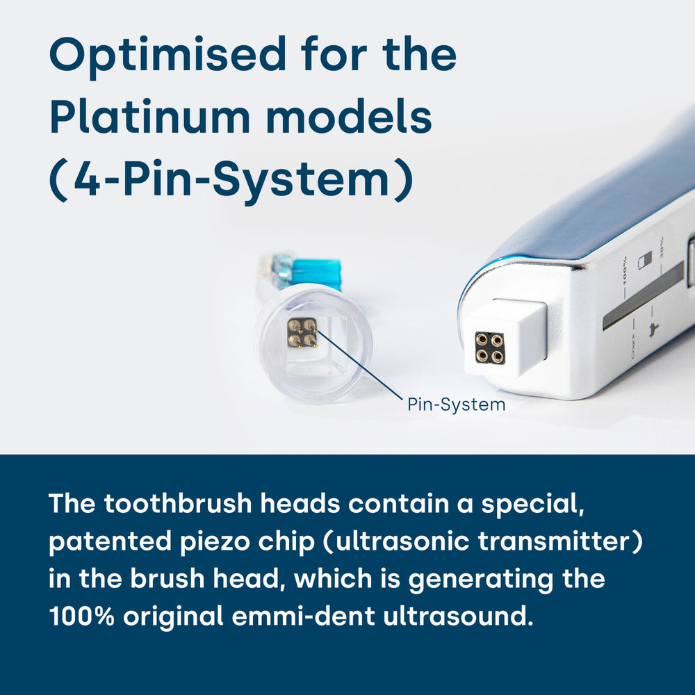 The ultrasonic brush heads of the emmi-dent Ultrasonic toothbrushes contain a special, patented piezo chip (ultrasonic generator) in the brush head to generate the 100% original emmi-dent Ultrasound. In the sockets of the emmi-dent Platinum Ultrasonic brush heads have 4 contact pins for connection to the emmi-dent Platinum handpiece integrated. This innovation prevents jamming when plugging in and the ultrasonic brush head can be easily plugged in and removed. In addition, thanks to the optimized ultrasonic timing, these are up to 4 times more effective than the brush heads of the emmi-dent Metallic.