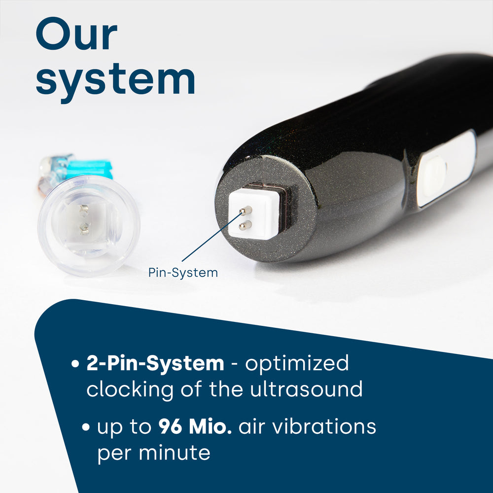 Electric toothbrushes include rotary toothbrushes, sonic toothbrushes and ultrasonic toothbrushes. While the former usually have round brushes that rotate alternately from left to right, sonic toothbrushes are equipped with elongated, vibrating heads. With 20,000 to 40,000 vibrations per minute, they achieve significantly higher mechanical movements than rotary brushes. Ultrasonic toothbrushes are a completely different technology. While rotary and sonic toothbrushes remove the biofilm with the help of mechanical movements, the emmi-dent Metallic works with up to 96 million ultrasonic vibrations per minute and does not require any mechanical movements to clean teeth. Motionless tooth cleaning thanks to the latest ultrasonic technology or brushing teeth without scrubbing.