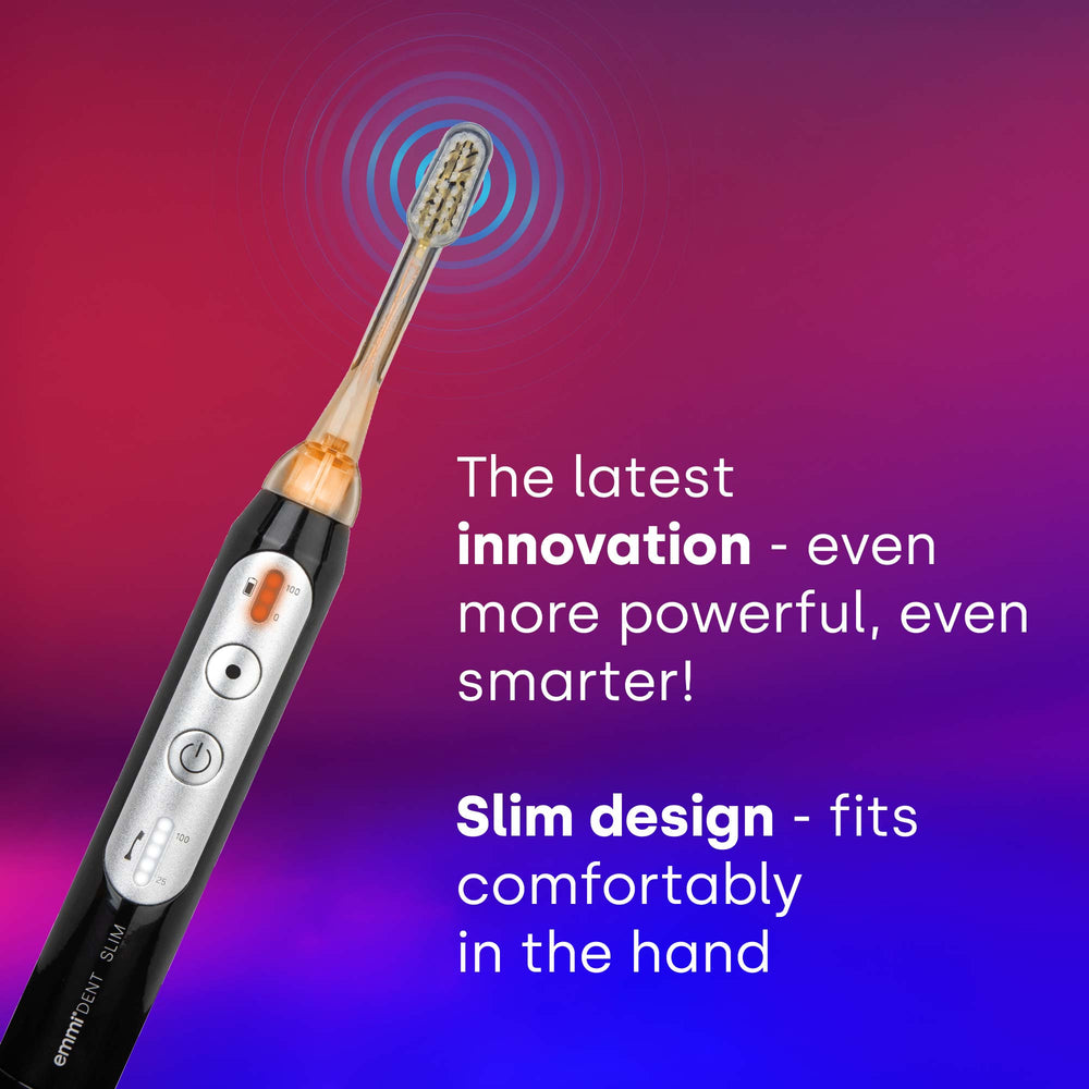 Thanks to the ergonomic, slim design of the emmi-dent Slim, the ultrasonic toothbrush fits comfortably in the hand and is smarter and more powerful than ever before.