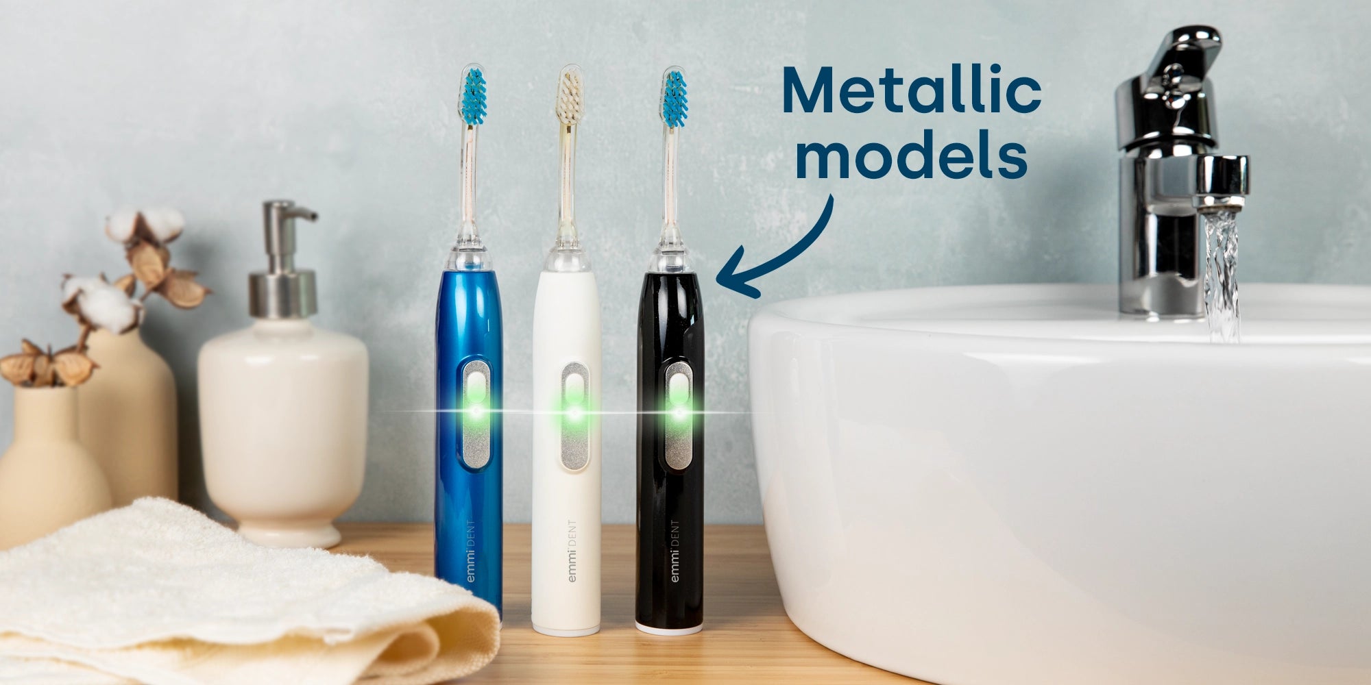 El cepillo de dientes ultrasónico emmi-dent es la última generación de cepillos de dientes o de higiene dental que utiliza ondas ultrasónicas para eliminar el biofilm y reducir la placa y las bacterias de los dientes. Los cepillos de dientes que funcionan con ultrasonidos han revolucionado el cepillado de dientes desde 2013. La ventaja decisiva frente a los cepillos de dientes manuales clásicos o los cepillos de dientes eléctricos es que los cepillos de dientes ultrasónicos funcionan prácticamente sin contacto y sin movimientos mecánicos. De este modo, la limpieza se realiza de forma especialmente suave y, al mismo tiempo, fiable y exhaustiva. ¡En combinación con una pasta de dientes ultrasónica especial, podrás llegar incluso a las zonas más difíciles de alcanzar sin esfuerzo! El resultado es una higiene bucal significativamente mejorada que usted podrá sentir. Después de la primera aplicación, sus dientes se sentirán agradablemente suaves y limpios, ¡como después de una limpieza dental profesional en el dentista!