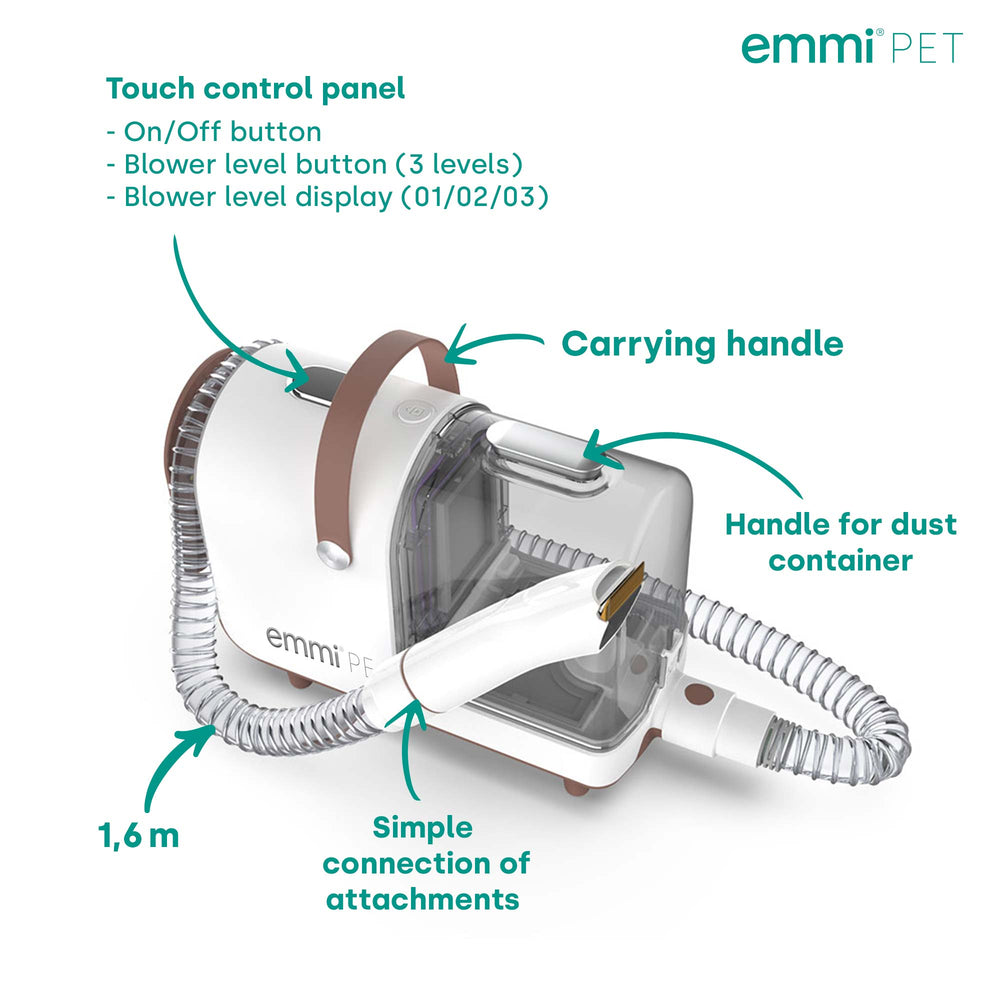 Dispositivo todo en uno: Emmi-pet Grooming Kit Home combina cortadora, peine y aspiradora en un solo dispositivo. Su diseño único te permite cortar y aspirar el cabello al mismo tiempo, para que nunca más tengas que preocuparte por los pelos sueltos. Esto hace que el cuidado de su mascota sea sencillo y eficiente.