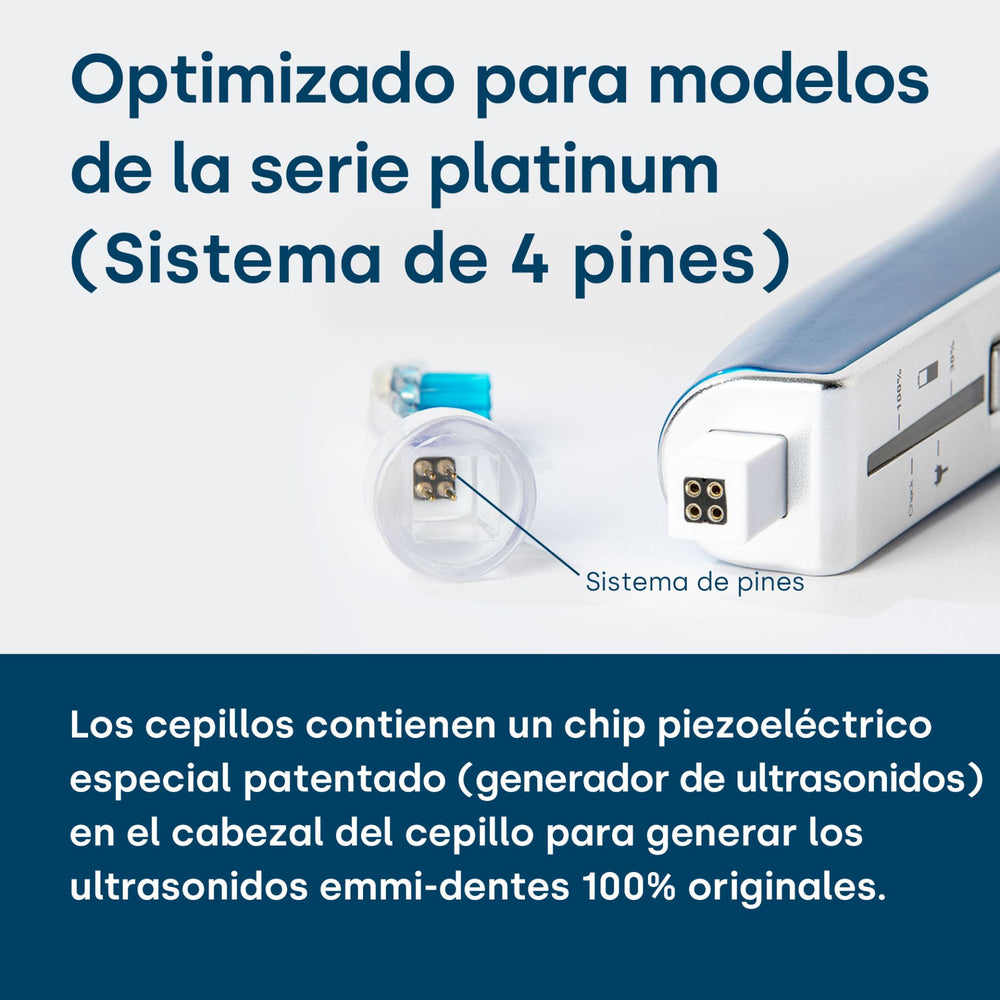 Los cabezales de cepillos ultrasónicos de los cepillos de dientes ultrasónicos emmi-dent contienen un chip piezoeléctrico especial patentado (generador ultrasónico) en el cabezal del cepillo para generar el ultrasonido 100% original de emmi-dent . En las bases de los cabezales de cepillo ultrasónico emmi-dent Platinum se han integrado cuatro pines de contacto para la conexión a la pieza de mano emmi-dent Platinum. Esta innovación evita que se atasque al enchufarlo y el cabezal del cepillo ultrasónico se puede enchufar y quitar fácilmente. Además, gracias a la sincronización ultrasónica optimizada, son hasta 4 veces más efectivos que los cabezales de cepillo Metallic de emmi-dent .