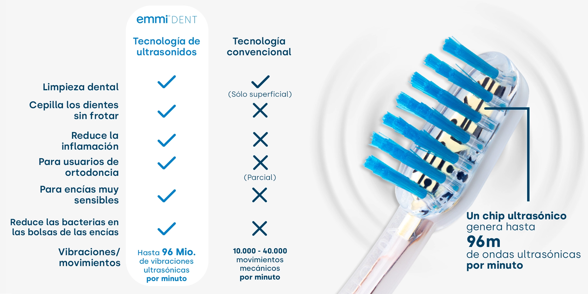 El cuidado dental con cepillos de dientes convencionales se limita a las zonas de la boca que alcanza el cepillo rotatorio o sónico. A diferencia de los cepillos de dientes eléctricos convencionales, el cepillo de dientes ultrasónico funciona completamente sin presión transmitiendo vibraciones. Esto significa que toda la cavidad bucal queda limpia a fondo.