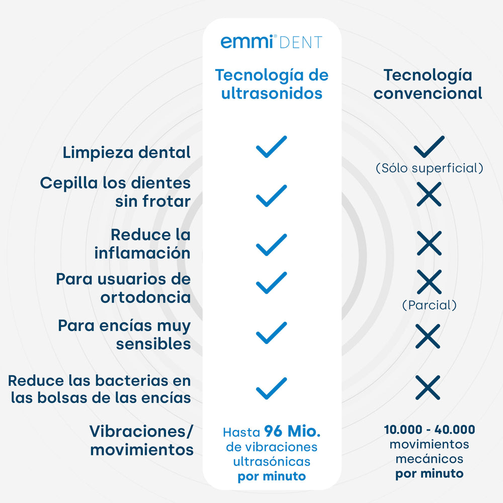 La tecnología de ultrasonidos ha demostrado ser eficaz en la limpieza dental profesional en el dentista. Se utiliza un ultrasonido “duro”, que tiene una frecuencia baja y una potencia alta. Los dentistas han utilizado este método con éxito durante muchos años para eliminar el sarro y otros contaminantes. El cepillo de dientes ultrasónico también permite el uso diario de la tecnología ultrasónica en casa. El innovador emmi-dent utiliza un ultrasonido “suave” de alta frecuencia y baja potencia.