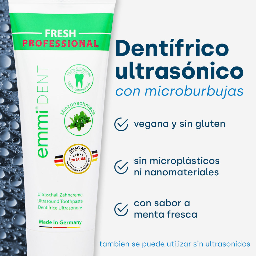 La tecnología de ultrasonidos ha demostrado ser eficaz en la limpieza dental profesional en el dentista. Se utiliza un ultrasonido “duro”, que tiene una frecuencia baja y una potencia alta. Los dentistas han utilizado este método con éxito durante muchos años para eliminar el sarro y otros contaminantes. El cepillo de dientes ultrasónico también permite el uso diario de la tecnología ultrasónica en casa. El innovador emmi-dent utiliza un ultrasonido “suave” de alta frecuencia y baja potencia.