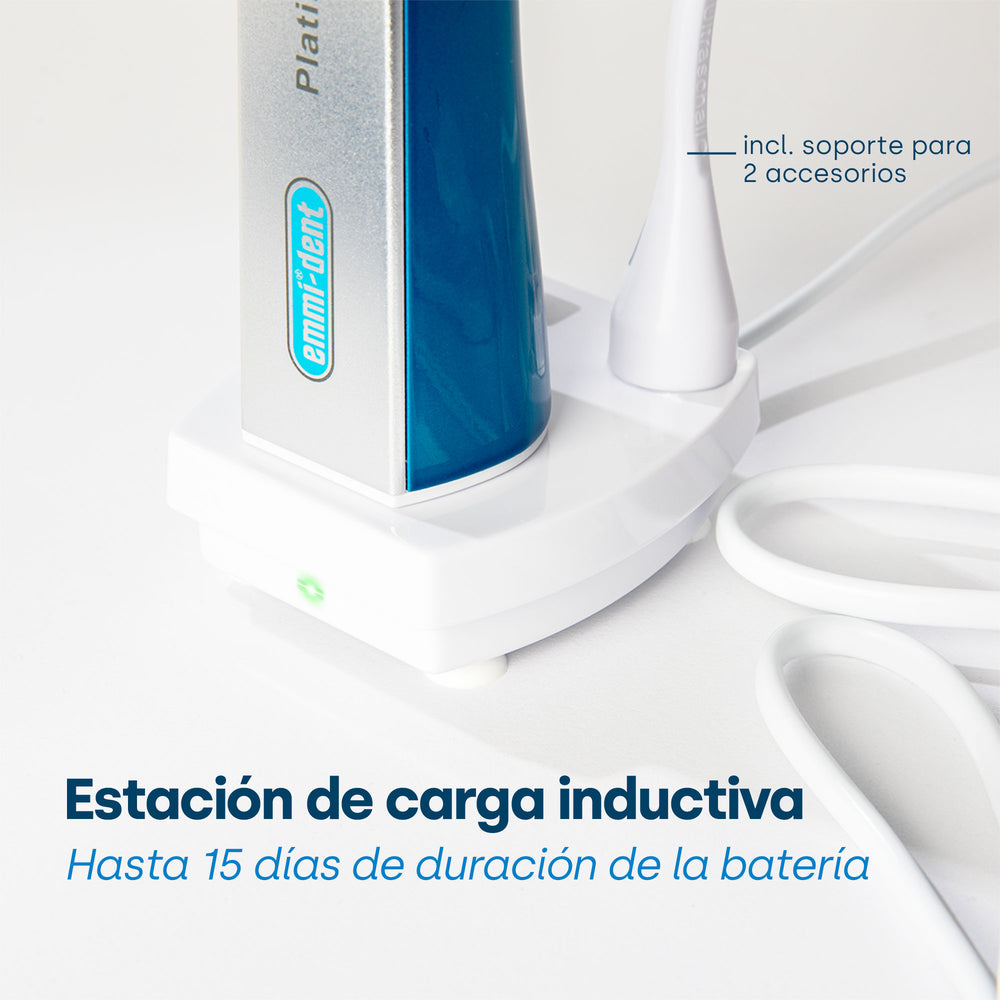El emmi-dent Platinum Care tiene una batería de mayor duración que sus modelos predecesores. Con un uso regular de 2 a 3 veces al día, el Platinum Care puede durar hasta 15 días antes de necesitar recargarse. Esta batería de larga duración (iones de litio) ofrece comodidad y uso ininterrumpido y elimina la necesidad de cargas frecuentes.