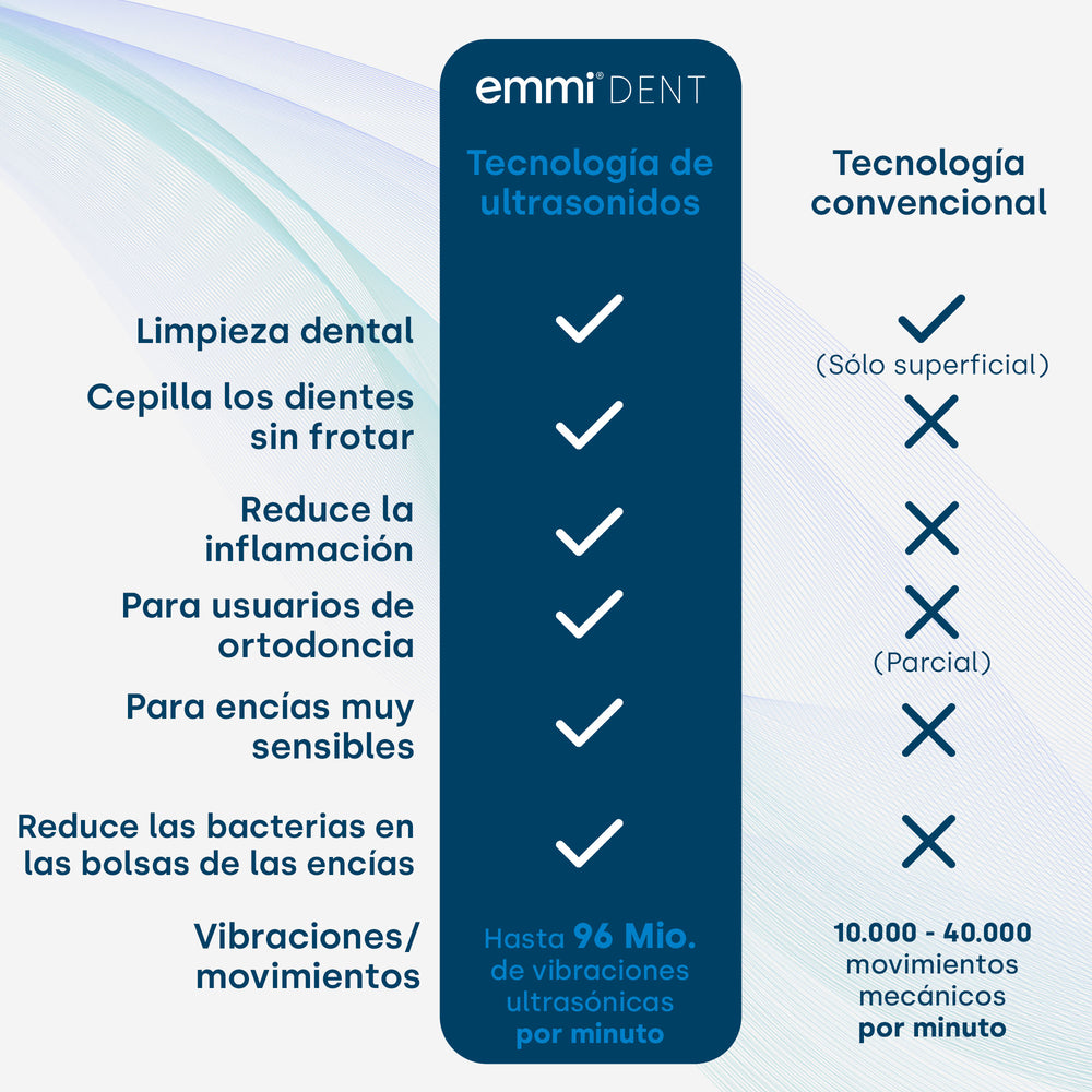 La tecnología de ultrasonidos ha demostrado ser eficaz en la limpieza dental profesional en el dentista. Se utiliza un ultrasonido “duro”, que tiene una frecuencia baja y una potencia alta. Los dentistas han utilizado este método con éxito durante muchos años para eliminar el sarro y otros contaminantes. El cepillo de dientes ultrasónico también permite el uso diario de la tecnología ultrasónica en casa. El innovador emmi-dent utiliza un ultrasonido “suave” de alta frecuencia y baja potencia.