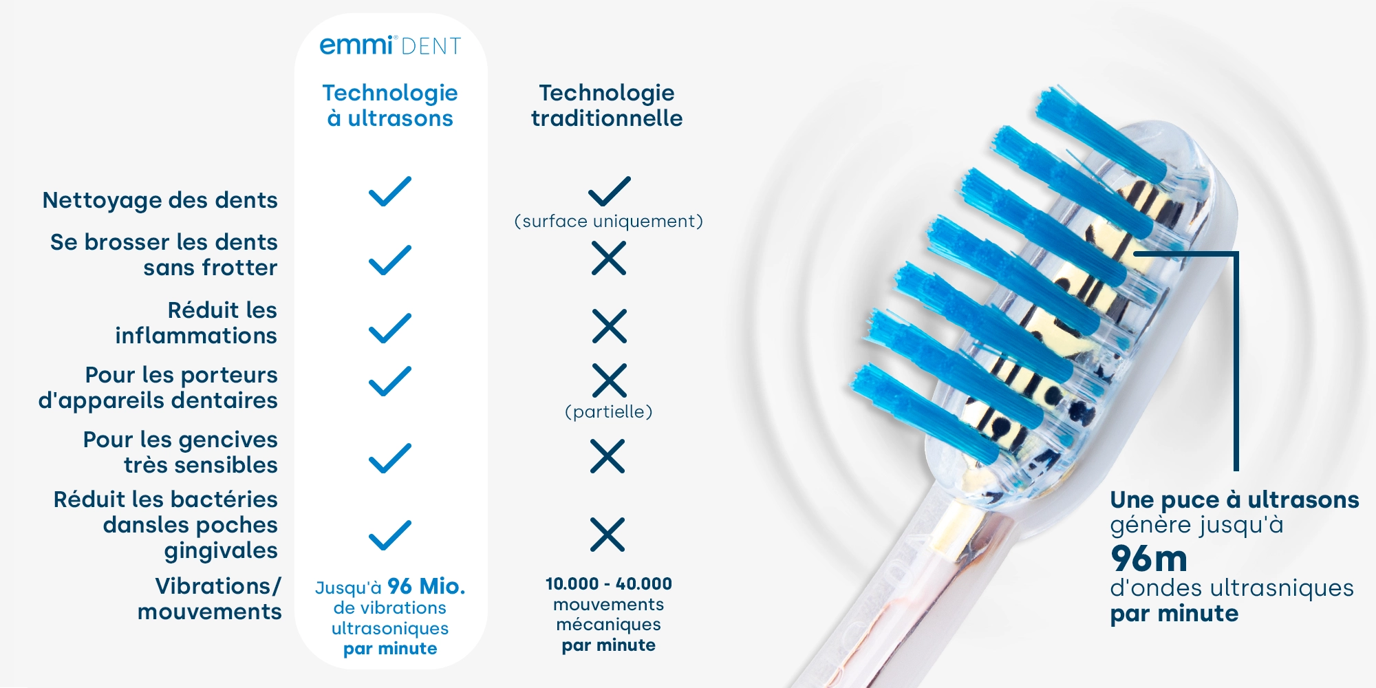La technologie des ultrasons a prouvé son efficacité dans le domaine du nettoyage professionnel des dents. Il utilise des ultrasons « puissants » à basse fréquence mais à haute intensité pour éliminer efficacement le tartre et autres dépôts. Cette méthode est utilisée avec succès par les dentistes depuis des années. La brosse à dents à ultrasons emmi-dent permet d'utiliser quotidiennement cette technologie avancée à la maison en utilisant un ultrason « doux » à haute fréquence et à faible intensité.
