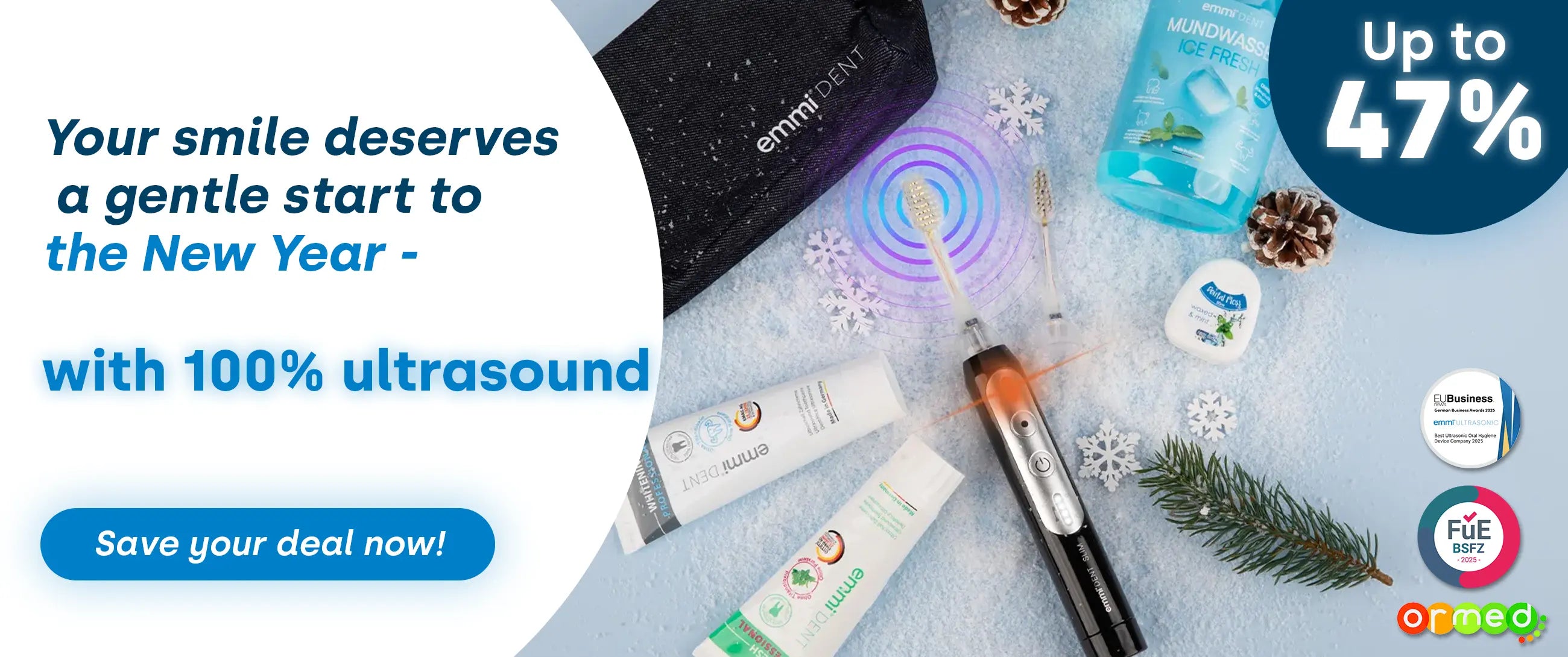 La brosse à dents à ultrasons d' emmi-dent offre un nouveau principe de fonctionnement avec une technologie sophistiquée et donc un maximum d'avantages. Les méthodes de nettoyage conventionnelles telles que le brossage des dents avec une brosse à dents manuelle ou électrique fonctionnent avec un macro-nettoyage. Avec des mouvements mécaniques, un utilisateur atteint 20 000 à 40 000 vibrations par minute. En revanche, il existe la technologie à ultrasons innovante, sans mouvement et presque sans contact d' emmi-dent . Ce procédé de micro-nettoyage permet d’atteindre jusqu’à 96 millions de vibrations par minute. L' emmi-dent nettoie même les zones difficiles d'accès de la bouche de manière professionnelle et en profondeur. Les ondes ultrasonores pénètrent dans les plus petits interstices, même entre les appareils dentaires et les implants. Des études scientifiques (Ormed® - Université de Witten/Herdecke) confirment qu'emmi -dent peut être utilisé avec succès contre la plaque dentaire , la parodontite, la gingivite (inflammation des gencives) ainsi que pour la thérapie d'entretien parodontal . Et tout cela sans aucun mouvement de brossage.