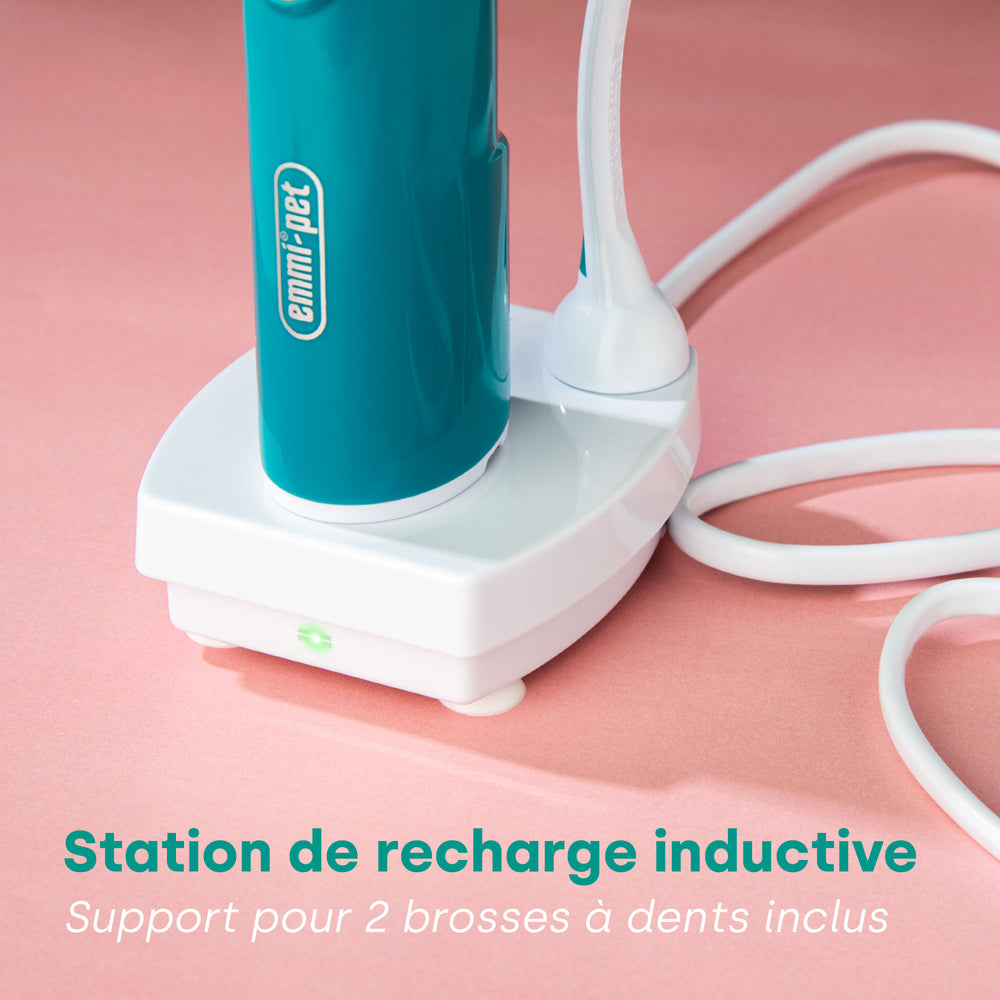 L'offre comprend la brosse à dents à ultrasons emmi-pet ainsi qu'une station de charge, deux têtes de brosse à ultrasons emmi-pet ( 1 x grande / 1 x petite ) et le dentifrice à ultrasons emmi-pet pour animaux .