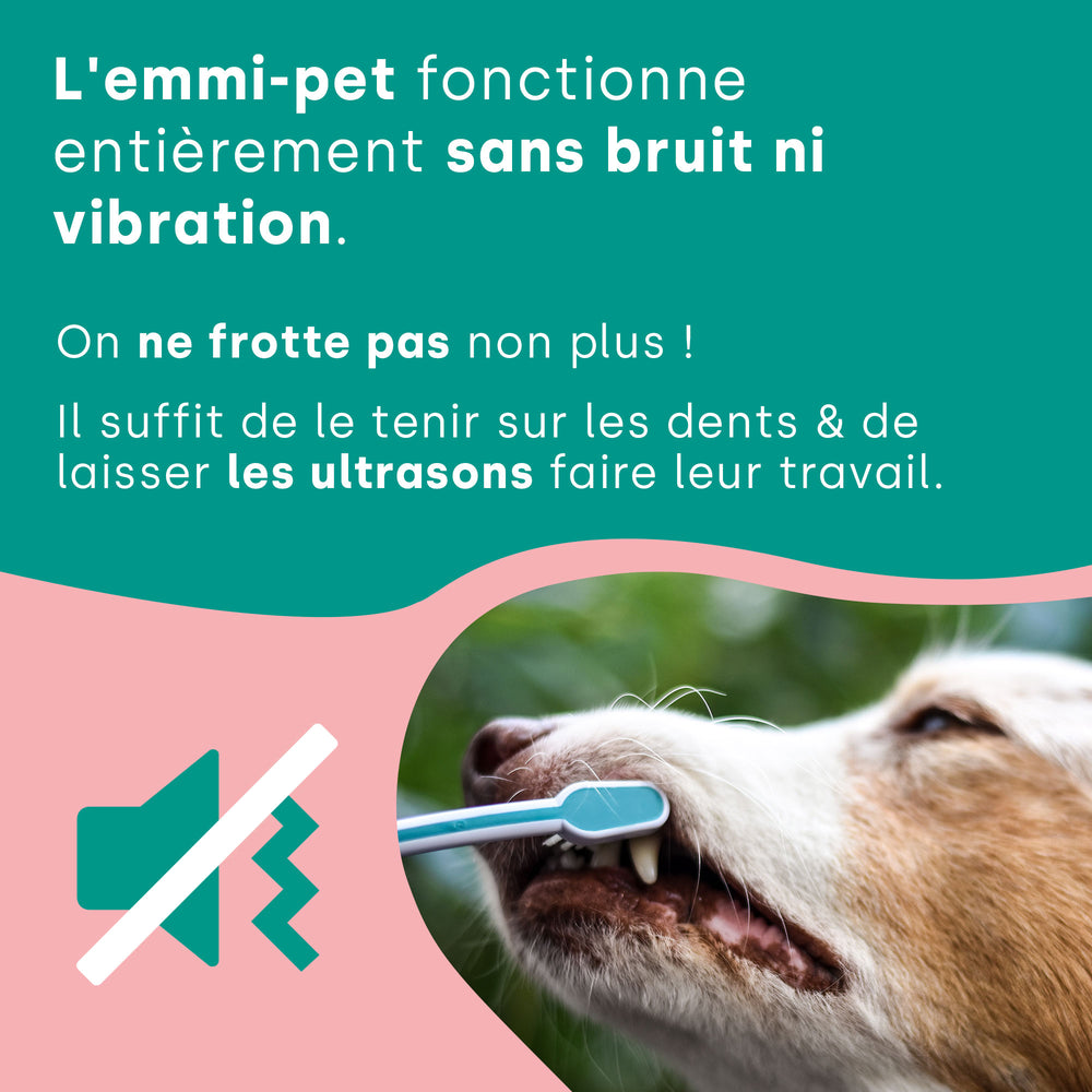 L'emmi-pet 2.0 est basé sur une technologie ultrasonique brevetée (jusqu'à 96 millions de vibrations ultrasoniques par minute) et, lorsqu'il est utilisé régulièrement, prévient efficacement le tartre et réduit la plaque dentaire. Une utilisation régulière prévient non seulement la formation de plaque dentaire, mais masse et renforce également les gencives et réduit l'inflammation des gencives existante.