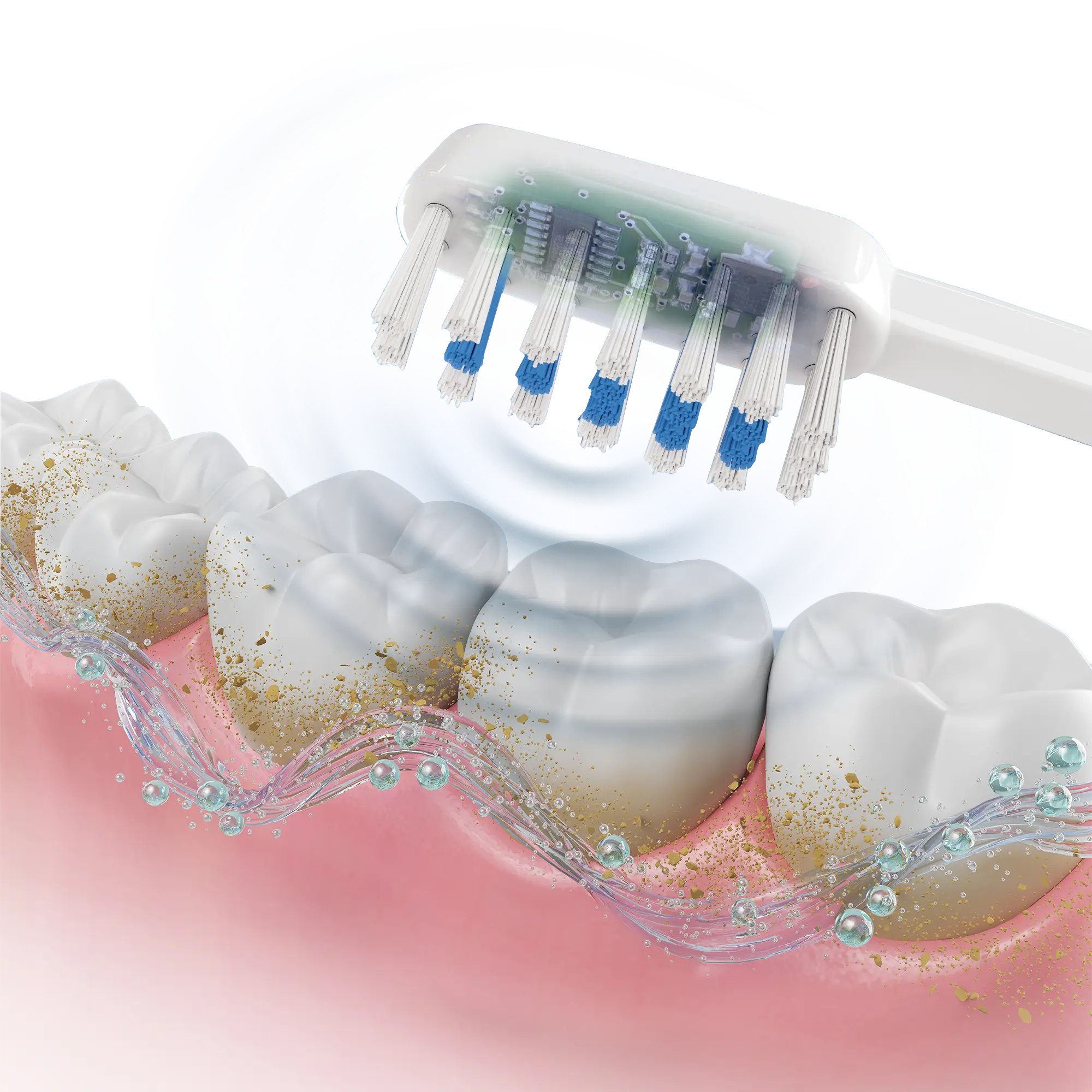 Les fines vibrations ultrasoniques pénètrent profondément dans les espaces entre les dents et les gencives, éliminant les bactéries même dans les endroits difficiles d'accès et prévenant ainsi efficacement la carie dentaire, la plaque dentaire et l'inflammation. Avec une utilisation régulière, le déclin de la gingivite et de la parodontite peut être activement favorisé.