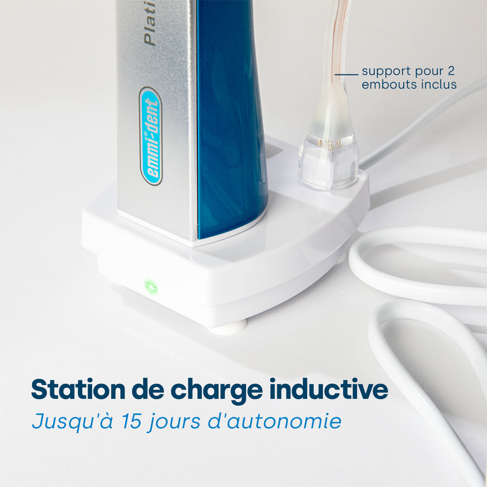 L'emmi-dent Platinum a une durée de vie de la batterie plus longue que ses modèles prédécesseurs. Avec une utilisation régulière 2 à 3 fois par jour, le Platinum peut durer jusqu'à 15 jours avant de devoir être rechargé. Cette durée de vie prolongée de la batterie (lithium-ion) offre commodité et utilisation ininterrompue et élimine le besoin de charges fréquentes.
