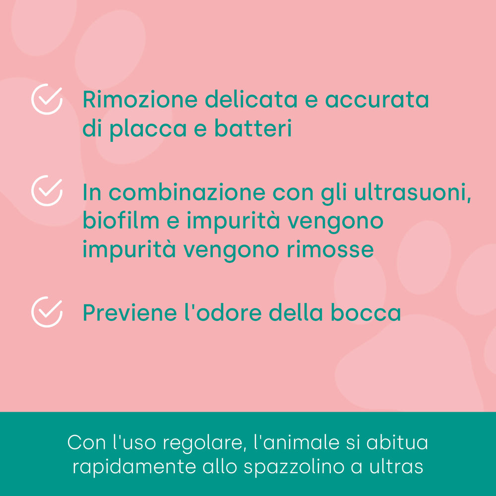 Utilizzare il dentifricio Emmi-Pet insieme allo spazzolino ultrasonico Emmi-Pet è semplice ed efficace. Applicare una piccola quantità di dentifricio sullo spazzolino e lasciare che lo spazzolino ultrasonico faccia il suo lavoro. Gli ultrasuoni creano microbolle che penetrano negli spazi tra i denti e li puliscono a fondo. Poiché non è necessario spazzolare meccanicamente, le gengive non vengono irritate e l'applicazione risulta particolarmente piacevole per il vostro animale domestico.