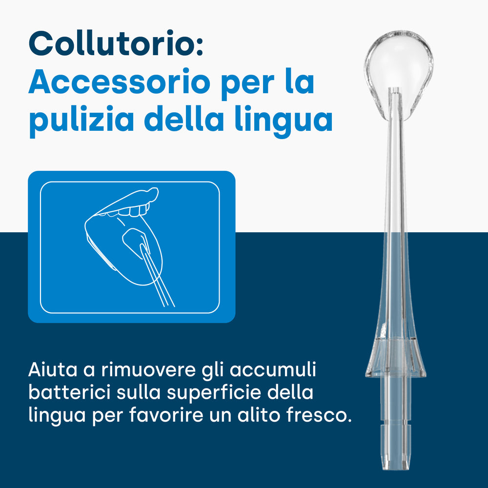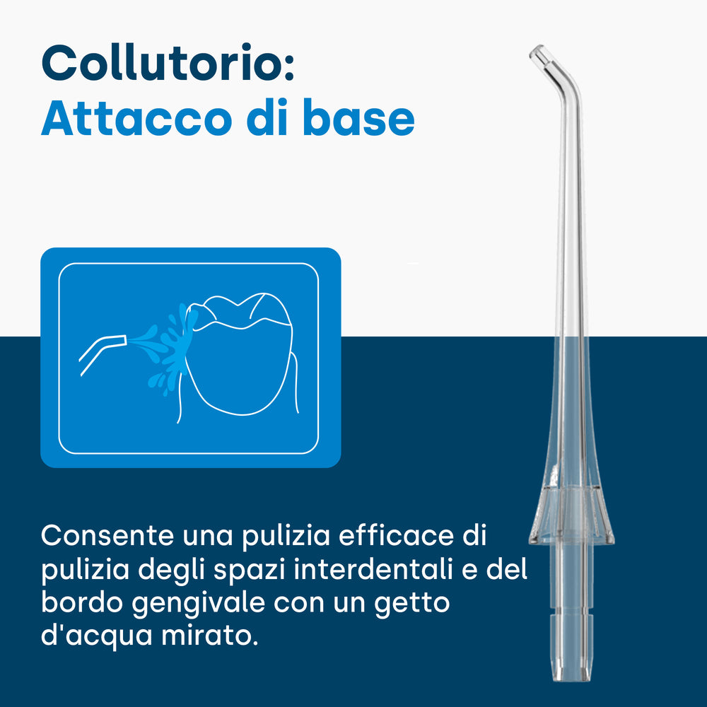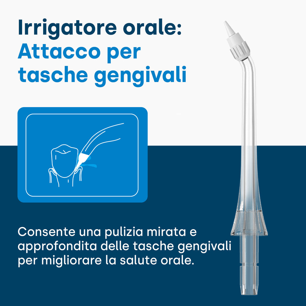 Abbiamo l'ugello più adatto per ogni applicazione! Grazie ai quattro ugelli di attacco inclusi, avrai l'ugello giusto per ogni attività di pulizia. Che si tratti di apparecchi ortodontici, ponti o impianti, l'irrigatore orale è ideale per rimuovere i depositi negli spazi tra i denti o in altre zone difficili da raggiungere.