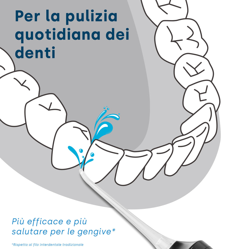 Una pulizia accurata dei denti con uno spazzolino a ultrasuoni garantisce risultati eccellenti sia al mattino che alla sera. Spesso però si trascurano gli spazi tra i denti, dove possono accumularsi particelle di cibo e batteri, favorendo la formazione di placca e carie. Come integrazione alla cura quotidiana dei denti, consigliamo l'uso di un irrigatore orale.