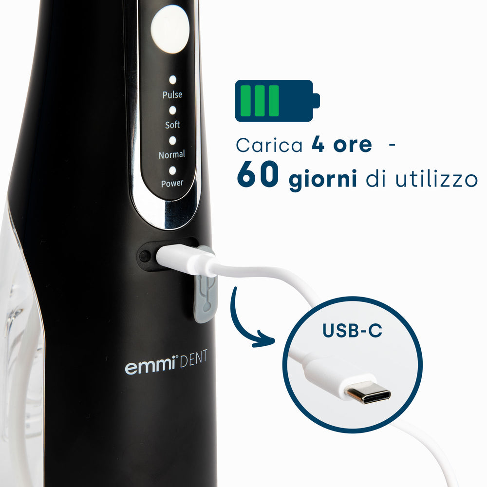 Gli idropulsori orali sono disponibili in vari modelli: dai modelli che si collegano direttamente al rubinetto e che quindi limitano la libertà di movimento tramite un tubo dell'acqua, agli idropulsori orali fissi con un serbatoio dell'acqua esterno, che sono anche limitati nella loro maneggevolezza. emmi-dent ha riconosciuto queste sfide e ha sviluppato una soluzione innovativa: un irrigatore orale pratico, semplice ed efficace. L'idropulsore elettrico emmi-dent è caratterizzato dal suo design senza fili, che consente una mobilità illimitata in tutta la cavità orale. Dotato di un capiente serbatoio d'acqua e di una batteria integrata, offre la massima praticità senza fastidiosi cavi o tubi flessibili. Basta riempire il serbatoio con acqua e caricare la batteria: il dispositivo è pronto all'uso. Inoltre, l'idropulsore emmi-dent è il compagno ideale quando si viaggia grazie alle sue dimensioni compatte. I vantaggi dell'idropulsore emmi-dent: - Senza fili per una libertà di movimento illimitata - Design compatto, perfetto per chi è in movimento - Serbatoio dell'acqua da 300 ml nel manipolo per un facile riempimento - Facile ricarica della batteria tramite USB-C (carica per 4 ore, utilizzo per 60 giorni) Se stai cercando un prodotto che si adatti perfettamente al tuo stile di vita e alle tue esigenze di attenta igiene dentale, l'idropulsore emmi-dent offre una soluzione su misura. Sviluppato per gli utenti che apprezzano un'igiene orale accurata e rilassata sia all'inizio della giornata che alla fine della serata, stabilisce nuovi standard nella pulizia dei denti.
