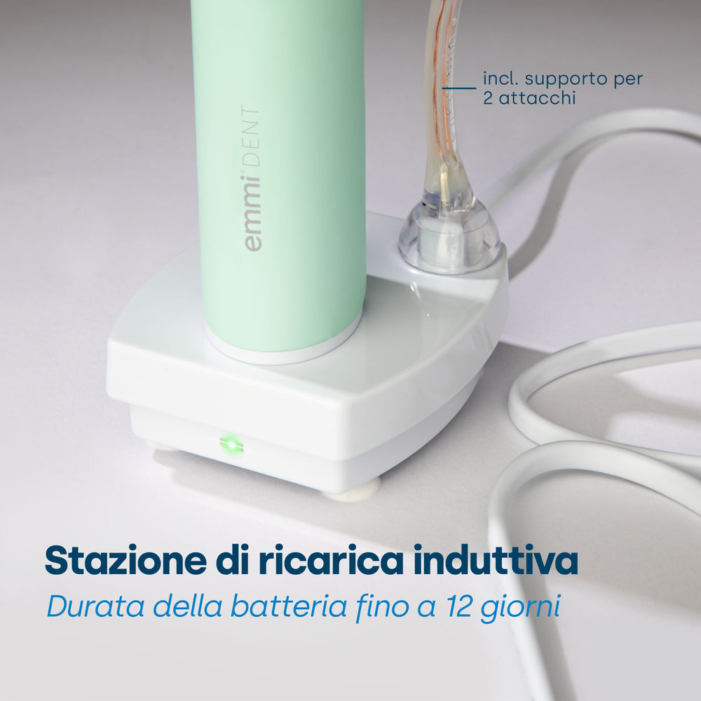 Grazie alla tecnologia ad ultrasuoni antiabrasione, emmi-dent Metallic è particolarmente indicato per persone con gengive sensibili, impianti, apparecchi ortodontici o patologie dentali come la parodontite. Le delicate vibrazioni puliscono a fondo senza irritare denti o gengive. In questo modo i denti rimangono sani e lo smalto viene protetto.