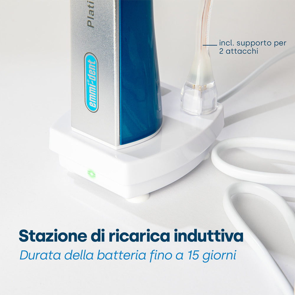 La tecnologia ad ultrasuoni sta rivoluzionando il modo di pulire e prendersi cura dei denti. emmi-dent Platinum è la prima generazione di spazzolini ultrasonici emmi-dent con sistema a 4 pin. Ciò significa che emmi-dent Platinum genera fino a 4 impulsi ultrasonici al secondo.