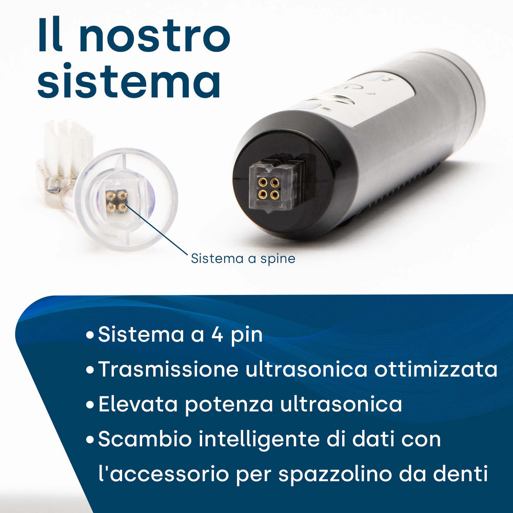 La funzionalità specifica dello spazzolino ad ultrasuoni ne influenza l'utilizzo. Gli spazzolini tradizionali vengono fatti scorrere lungo le file dei denti e sono sempre a contatto con essi. La nostra sofisticata tecnologia a ultrasuoni funziona praticamente senza contatto. Basta muovere delicatamente la testina dello spazzolino sui denti. Oltre allo spazzolino ultrasonico, utilizzare uno speciale dentifricio ultrasonico. 75 millilitri sono sufficienti per circa quattro settimane di utilizzo.
