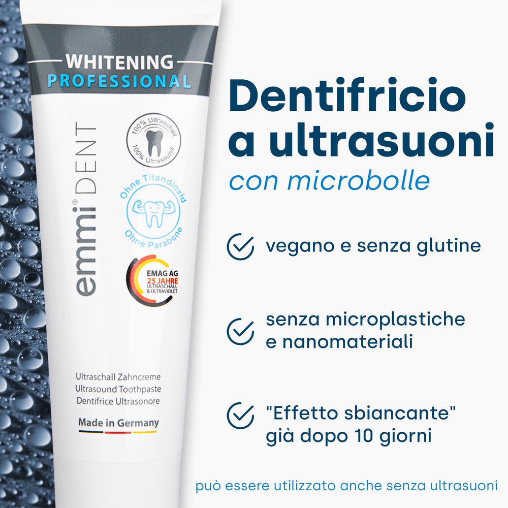 Il dentifricio sbiancante a ultrasuoni Emmi-Dent ti aiuta a ottenere un sorriso bianco smagliante senza i problemi dei metodi convenzionali. Grazie all'avanzata tecnologia ultrasonica abbinata allo spazzolino a ultrasuoni, rimuove delicatamente le macchie ostinate e fa brillare i denti. Attirerai con ansia gli sguardi di ammirazione quando sfoggerai il tuo sorriso radioso. Può essere utilizzato anche con lo spazzolino a ultrasuoni.